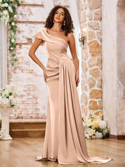 One-Shoulder Satin Dresses with Sweep Train Peach